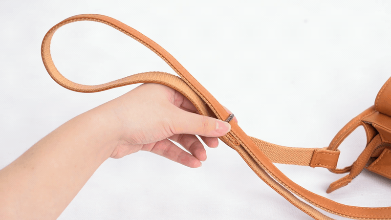 The strap features a leather surface and a woven fabric underside, combining elegance with anti-slip functionality for a more comfortable and stylish carry.